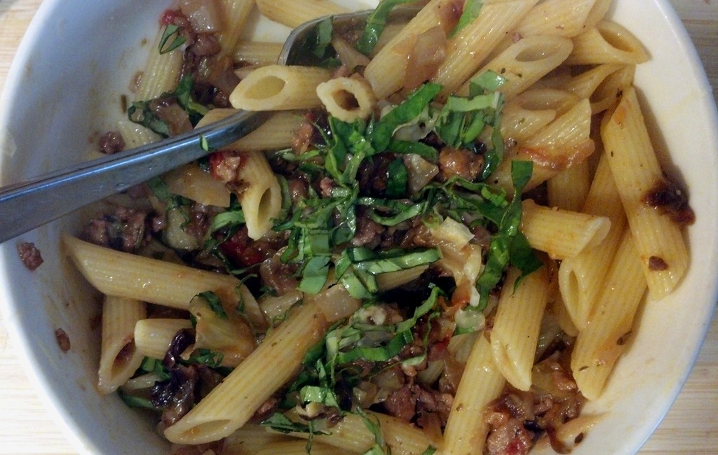 Saute the sausage, breaking up as you go. Chop the veg while you’re doing this. Remove sausage, and drain. Add a bit more olive oil to the pan if you need it. Saute the vegetables at medium heat for 10 minutes or so to wilt. Then add back in the sausage along with the tomatoes, and some seasonings. Options: fines herbes, Italian seasoning, fresh or dry oregano, pepper flakes, fennel seeds. Cook for about 20 minutes, adding water, stock, or wine as needed.