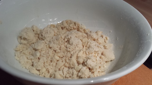 Put all dry ingredients plus butter into a bowl and work with a pastry cutter until the butter is in pea-sized pieces, inspecting with your hands to make sure there are no large clumps. (if it’s warm outside or things are getting soft, refrigerate it at this point to harden the butter back up.) This first part can be done in a food processor, but the next part has to be done by hand. Add a little water at a time, working the dough with your hands until it looks “shaggy.” Some parts will get there sooner than others, so push the finished dough aside as you go. Flick drops of water in at the very end to keep the dough from getting too wet.