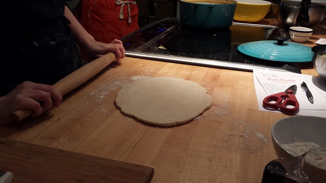 Lightly flour the working surface and roll out your dough. Roll in one direction only, back and forth, not side to side, turning and flipping dough as needed. It should be about 1” bigger than the pie plate. Check the thickness with your fingers, adjusting if you have thin or thick spots. Brush off flour with a pastry brush and slip it into the pie plate. Gently press, without stretching, the crust into the corner and sides of the dish.